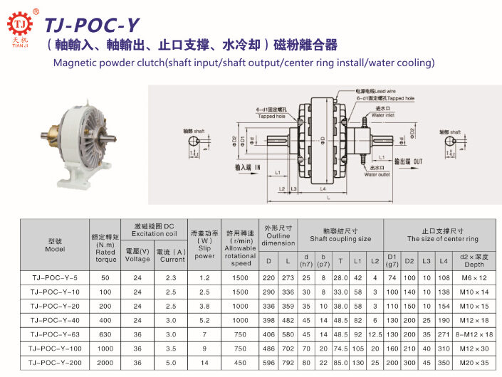 天機牌帶機座水冷式磁粉離合器TJ-POC-Y的安裝尺寸和具體型號參數如下: