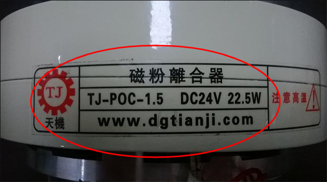 4、標(biāo)牌,每個規(guī)格型號的磁粉離合器或制動器的磁軛圓周都會貼有標(biāo)牌,包括信息有型號、規(guī)格、電壓、功率、品牌、logo、名稱等。如下圖: