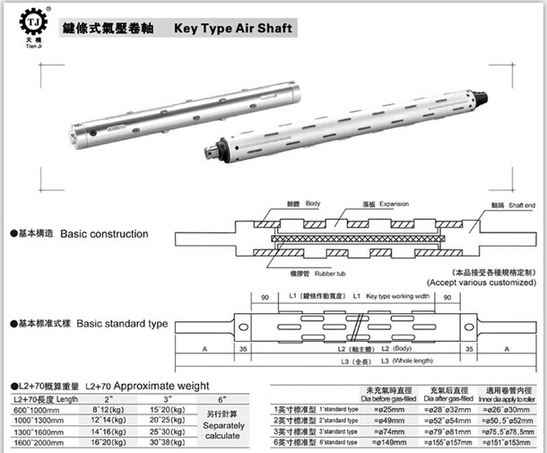 用途很廣,凡有收卷、放卷、分切的的機器,都可適用氣脹軸,甚至包括輕金屬行業(yè)。天機傳動鍵條式氣脹軸的規(guī)格尺寸及參數(shù)如下:(具體規(guī)格可按客戶要求定制)