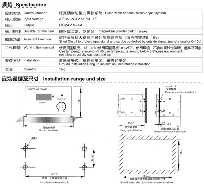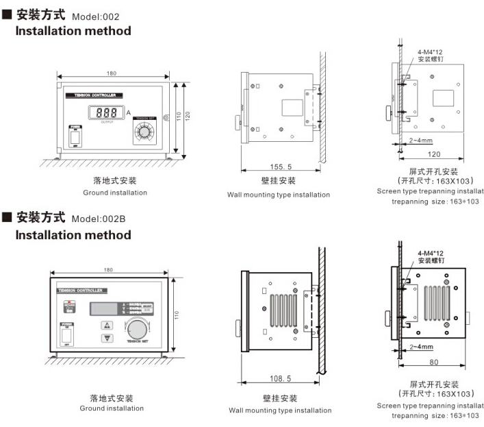 自動張力控制器(張力控制系統)的安裝方式,常見的有三種:壁掛式安裝、落地式安裝、面板鑲嵌式安裝,關于其接線情況參考產品使用說明書。 具體規格和及安裝尺寸如下: